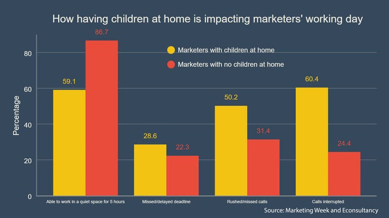 Ülke çapında kilitlenme nedeniyle evde 16 yaşından küçük çocukları olan pazarlamacılar, işverenlerinin destekleyici ve iyi iletişim kurduklarını hissetmelerine rağmen, çocuk sahibi olmayan meslektaşları kadar işte etkili olmak için mücadele ediyorlar. Econsultancy tarafından küresel olarak yürütülen 1.990 pazarlamacının yaptığı bir araştırmaya göre, çocuklu pazarlamacıların %46.6'sı normalden daha az verimli çalıştıklarını düşünüyor. Bu, evde daha az verimli hisseden çocuk sahibi olmayan pazarlamacıların %41,7'siyle karşılaştırılmaktadır. Bu arada, ebeveynlerin yaklaşık %22.5'i anne-baba olmayanların sadece %16.3'üne kıyasla son iki haftada 'çok daha fazla' çalıştıklarını düşünüyor. Buna karşılık, ebeveynlerin sadece %12,5'i evde çocuk sahibi olmayanların %15,2'sine kıyasla 'çok daha az' çalıştıklarını düşünmektedir. Çalışmak için yer bulmak, ebeveynlerin çocuklarını evde eğitmeleri için bir konudur. Evde 16 yaşından küçük çocukları olan pazarlamacıların sadece %59,1'i, günde en az beş saat boyunca sessiz bir alanda çalışabileceklerini, çocuksuzların% 86,7'sine kıyasla hissettiğini düşünüyor.